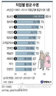 원광대 보건복지학부 김종인 교수팀은 최근 10년(2001~2010년)간 언론에 보도된 부음기사와 통계청 사망 통계자료를 토대로 직업군별 평균 수명을 비교분석한 결과를 4일 발표했다.
