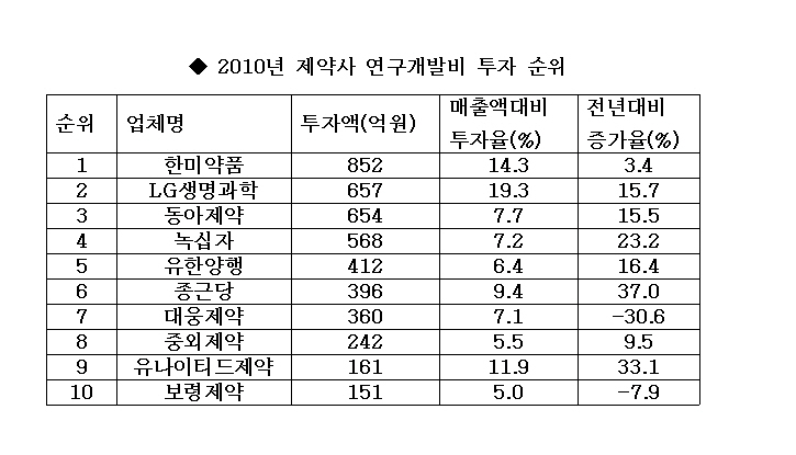 국내 제약사들의 연구개발(R&D) 투자 규모가 매출 순위와 별개인 것으로 나타났다.