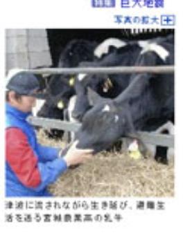 요미우리신문 보도에 따르면 대지진과 쓰나미로 폐허가 된 미야기현의 한 농업고교에 떠내려갔던 젖소 34마리 중 14마리가 살아 돌아왔다”고 보도했다.