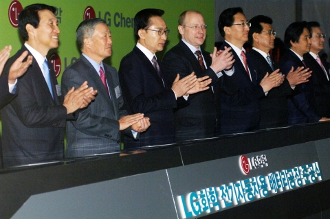 LG화학은 6일 충북 오창산업단지에 위치한 오창테크노파크에서 'LG화학 전기자동차용 배터리공장 준공식' 행사를 가졌다. 준공식에는 이명박 대통령과 최중경 지식경제부 장관, 구본무 LG 회장, 강유식 LG 부회장, 김반석 LG화학 부회장 등이 500여명이 참석했다.