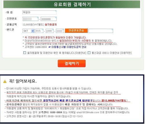 휴대폰 인증 창 아래 작은 글씨로 '월정액 결제'라고 명기되어 있지만 소비자들은 눈에 익숙한 휴대폰 인증창이 '본인 확인용'이라 생각하고 무심코 클릭하는 바람에 피해로 이어지고 있는 것.