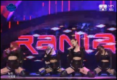 라니아는 8일 지상파 방송인 KBS 2TV '뮤직뱅크'에서 같은 컨셉으로 두번째 무대에 오를 예정이어서 논란은 증폭될 전망이다. (사진-Mnet '엠카운트다운' 방송 캡처)