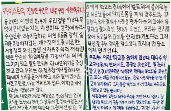 이어 "학교는 대외적으로는 개성 있고 창의적인 인재 육성을 표방하지만, 학교는 우리를 컨베이어 벨트 위에 줄 세워 놓고 틀에 억지로 몸을 끼워 맞추도록 강요한다"고 소리냈다. 이어 총장에게 "우리 목소리에 귀 기울여 말도 안되는 무한 경쟁과 신자유주의 정책을 폐기하고 학우들을 위한 카이스트를 건설하라"고 주장했다.