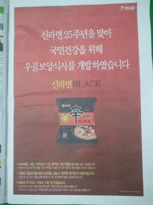 8일 농심은 '신라면 25주년을 맞아 국민건강을 위해 우골보양식사를 개발했다'고 신문 광고를 통해 홍보했다. 신제품 '신라면 블랙(BLACK)'은 양질의 콜라겐과 단백질, 칼슘이 풍부한 한국인의 보양식이라고 농심은 설명했다. 우골을 듬뿍 함유했기 때문에 원기회복에 좋은 건강보양식이라는 것이다.