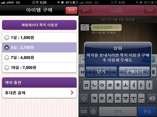 실제로 홍보 차원에서 무료앱을 배포하기도 했지만 곧 9.99$의 유료앱으로 전환했다 다시 무료앱으로 변경했다.회원을 모은 후 슬그머니 쪽지 서비스를 유료화한 것이다.