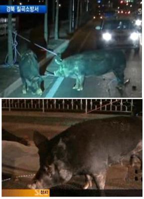 지난 11일 오후 11시경 경북 칠곡군 왜관읍에서 우리를 탈출한 흑돼지 두 마리가 인근 도로에 출연해 주민들을 깜짝 놀라게 했다.
