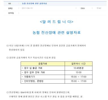 농협은 13일 오전 보도자료를 통해 "지난 12일 오후 5시쯤 발생한 전산장애로 중단된 금융거래가 현재까지 정상화 되지 않고 있다"고 전했으며, 창구 입출금 거래는 오전 9~10시, 창구업무전체 거래는 오후 1시, 자동화 기기는 오후 3~5시, 인터넷 뱅킹 및 폰뱅킹은 오후 11시 서비스 재개를 목표로 복구작업을 진행하고 있음을 공지했다.