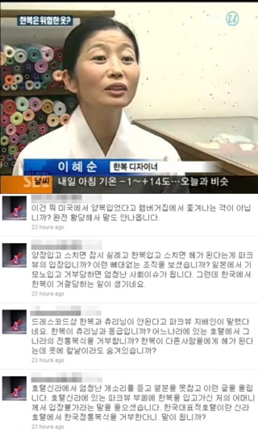 이어 김 씨는 "드레스코드상 한복과 트레이닝복이 안된다고 파크뷰 지배인이 말했다한다. 한복과 츄리닝이 동급인가. 어느 나라 호텔이 그 나라의 전통복식을 거부하는가. 한복이 다른 사람들에게 해가 된다는데 옷에 칼날이라도 숨겨져있느냐"고 신라호텔의 처우를 비판했다.