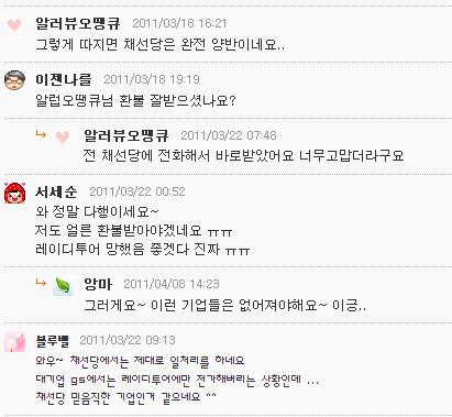 닉네임 '알러뷰오땡큐'사용자는 지난달 11일 '혹시나 싶어 채선당 쪽에 문의해서 서류 보냈고 6일 만에 환불 받았다'는 댓글을 남겼다.
