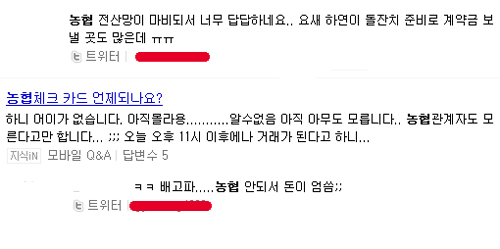 농협 이용자들은 “곧 아이 돌잔치라 이곳저곳 계약금 보낼 곳이 많은데 답답하다”, “농협이 안 되니 돈을 못 뽑아 밥을 못 먹고 있다”, “우리나라에서 농협 카드 안 쓰는 사람이 어디 있나, 그 많은 사람들이 이런 불편을 겪을 텐데 상상이 안 간다”는 등 답답함을 토로했다.