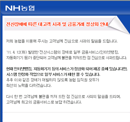 이에 대해 농협 관계자는 “14일 현재 전산장애는 대부분 안정된 상태며 신용카드와 체크카드도 14일 오후나 늦어도 15일까진 정상화될 것”이라며 “불편을 끼쳐드려 죄송하다. 현재 원인을 분석중이며 소비자 피해에 대한 보상방안도 강구하는 중”이라고 설명했다.