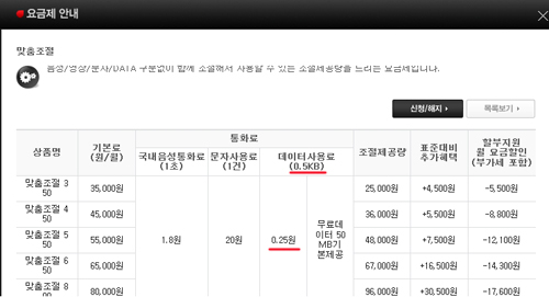일반적인 데이터사용료 부과 기준은 0.5KB 당 0.025원 정도지만 요금제에 따라 10배나 차이날 수 있어 소비자들의 각별한 주의가 요구된다.