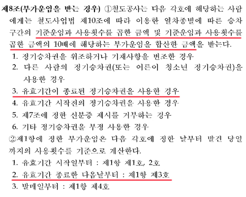 여객운송약관 및 부속약관 제8조에 따르면 유효기간이 종료된 정기승차권을 사용한 경우, 유효기간이 종료한 다음날부터 발견 당일까지의 사용횟수를 기준으로 기준운임과 사용횟수를 곱한 금액 및 기준운임과 사용횟수를 곱한 금액의 10배에 해당하는 부가운임을 합산한 금액을 지불해야 한다.