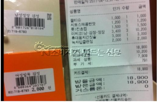 18일 인천시 부평구 부평1동에 거주하는 한 모(여.30)씨에 따르면 그는 지난 13일 집 앞 편의점에서 남성용 여성용 양말 총 세 켤레를 구입한 후 영수증을 살펴보다 흠칫했다.