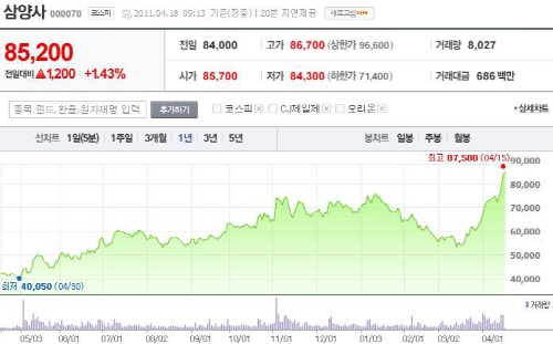 삼양사 주가는 실적개선에 힘입어 1년 전 4만원선에서 200% 이상 주가가 올랐다. 지난 3월15일 5만3천400원에서 한 달만에 8만7천500원으로 급등했다.
