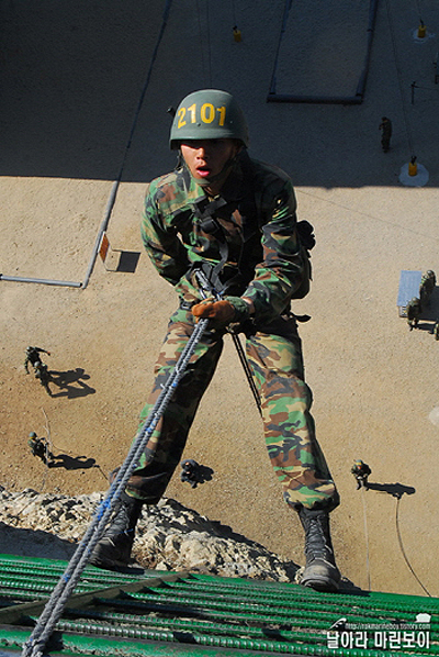사진 속에는 현빈이 2101 번호가 적힌 헬멧을 쓰고 21m 높이의 절벽에서 로프 하나만 의지한 채 레펠훈련을 소화하고 있는 모습이 담겨있다.
