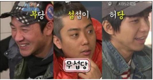 지난 17일 방송된 KBS 2TV ‘해피선데이-1박2일'에서는 ‘무섭당’이 결성돼 눈길을 끌었다. 방송에서 제작진은 팬들이 직접 지어준 이름이라며 무당(엄태웅), 섭섭이(은지원), 허당(이승기)이 한팀인 '무섭당'과 강호동, 이수근, 김종민이 함께하는 '바보당'으로 팀을 나눴다.