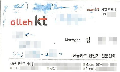 20일 경기 장암동에서 학원을 운영중인 장 모(남.45세)씨에 따르면 그는 지난해 6월경 카드단말기 영업사원과 처음 만났다. KT자회사 소속이라고 자신을 소개한 영업사원이 건넨 명함에는 KT로고가 선명하게 찍혀 있었다.