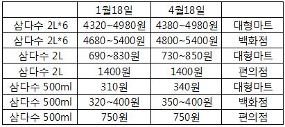 삼다수 500ml의 경우도 편의점을 제외하고 가격이 모두 올랐다. 3달 전 백화점 판매가격은 320~400원(100ml당 64~80원)이었으나, 4월18일 현재 350~400원(100ml당 70~80원)으로 인상됐다. 대형마트 역시 1병에 310원에 팔리던 것이 340원으로 상승했다.