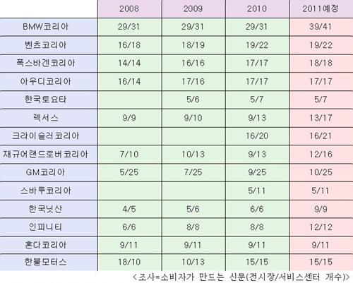 반면 벤츠코리아와 아우디코리아, 포드코리아, 푸조를 수입하는 한불모터스 등은 최근 3년간 1~2개의 서비스센터를 꾸준히 늘려왔으나 올해는 신규 확충 계획이 없다.