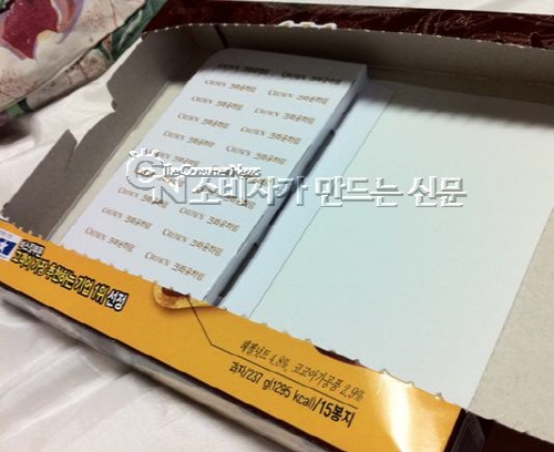 장 씨는 "원래 개별포장된 과자가 2단으로 쌓여 있어야 할텐데, 모서리 부분의 포장공간 때문에 달랑 2봉지밖에 없었다"며 "내용물은 줄이고 박스만 크게 만들어 과자가 많이 들어있는 것처럼 하는 눈속임 상술이 아니냐"고 불만을 털어놨다.