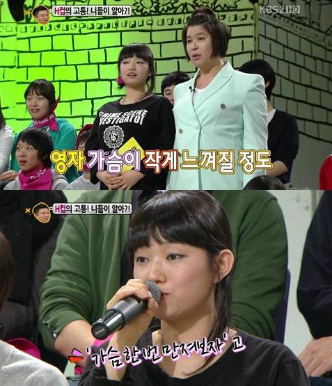 18일 밤 방송된 KBS 2TV '대국민토크쇼 안녕하세요'에서 한 여대생은 너무 큰 가슴으로 인한 고민을 토로했다.