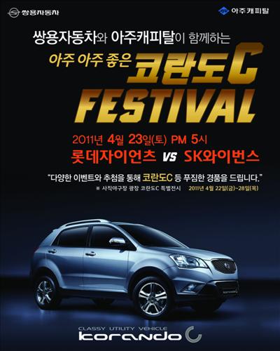 쌍용차는 오는 23일 부산 사직야구장에서 열리는 롯데 자이언츠와 SK 와이번스의 경기에 코란도C 출고 고객과 아주캐피탈 고객 1천명을 초청해 자이언츠를 응원하고, 경기 전 광장에 설치된 쌍용차 부스에서 응모한 관중을 대상으로 경기 중 추첨을 통해 코란도C 1대를 경품으로 제공한다.
