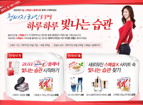 ‘2011 마이 스페셜 K 플래너 빛나는 습관 시작하기’ 이벤트에서는 스페셜 K 홈페이지에 자신만의 몸매관리 플랜을 등록하면 추첨을 통해 몸매관리를 위한 스케쳐스 운동화(10명)와 스페셜 K(270g x 2, 50명)를 증정한다.