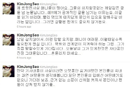 김종서는 이어 “만약 기사내용이 사실이라면 오랫동안 숨겨야했던 본인들의 속내는 과연 어땠을까 생각해 본다”라며 “일단 본인들의 입에선 어떤 얘기도 없으니 기다려 보자. 근거 없는 소문이 산처럼 커져서 본인이나 팬들이 상처받지 않기를”이라고 팬들을 향한 안타까운 마음을 드러냈다.
