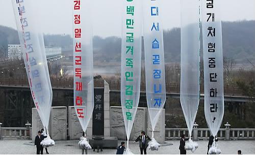 자유북한운동연합 회원들은 김일성 전 북한 주석의 생일인 15일 경기 파주시 임진각 망배단에서 대북 전단지를 살포했다. (사진=연합뉴스)