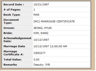 미국 네바다주 결혼기록을 열람해 입수한 이 결혼 증명서에는 서태지와 이지아의 이름과 함께 결혼한 날짜와 장소가 모두 적혀 있다.