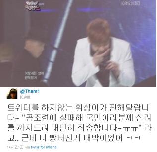 가수 휘성이 KBS2 '뮤직뱅크'에서 낸 방송사고에 대해 케이윌의 트위터를 통해 사과했다.