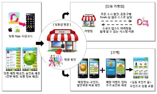 '딩동'은 위치확인시스템(GPS)과 가맹점에 설치된 신호발생기를 통해 위치정보를 인식하기 때문에 사용자가 주변 매장 정보를 손쉽게 확인할 수 있다. 매장을 직접 방문하게 되면 자동으로 방문이 확인돼 추가 포인트를 받을 수 있으며 해당 매장의 할인 정보와 맞춤형 이벤트 정보도 확인할 수 있다.