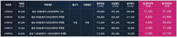 '스마트75'와 '스마트65' 요금제는 각각 기본료를 75,000원, 65,000원 지불하며 음성통화를 600분, 4000분 문자는 600건, 400건을 무료로 제공받으며 데이터는 무제한으로 이용할 수 있다. 이들의 단말기 실 구매가는 각각 52,800원, 105,600원이다. 그 외에도 통화량이 적은 분들을 위한 '스마트55', '스마트45' 요금제는 기본료를 각각 55,000원 45,000원을 지불하면 실 구매가가 211,200원, 290,400원으로 측정된다.
