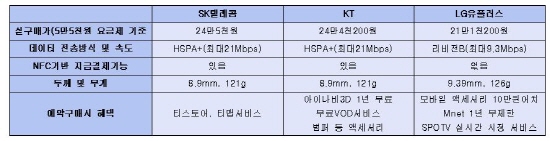LG유플러스와 비교하면 SK텔레콤과 KT의 혜택은 그리 크지 않은 편이다. KT는 사전가입자에게 내비게이션 맵 '아이나비3D'를 1년간 무료로 이용할 수 있게 해주었고 무료 VOD 서비스와 함께 범퍼를 비롯한 고급 액세서리를 제공할 계획이다. SK텔레콤은 T스토어, T맵 무료제공 등을 혜택을 내놨다.