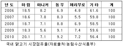 27일 관련업계에 따르면 국내 닭고기 시장은 하림(20.1%), 마니커(13.8%), 올품(10.1%), 동우(9.2%), 체리부로(7.2%) 등 5개사의 점유률이 60%를 넘고 있다. 올해 1월부터 모든 도계장의 닭고기 개별 포장 의무화 제도가 시행됨에 따라 이들 대형업체를 중심으로 시장재편이 가속화될 전망이다.