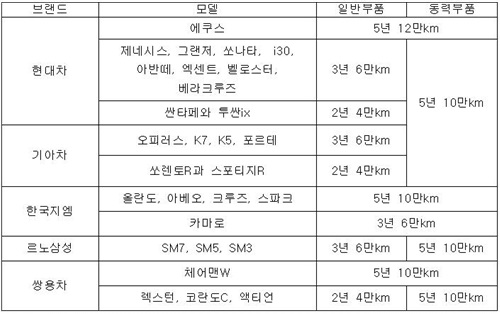 실제로 국내 자동차 업체들의 무상 보증기간은 브랜드와 차종에 따라 2년 4만km부터 5년 12만km까지 천차만별이다.