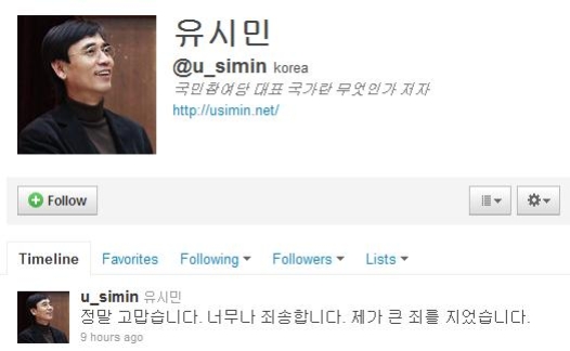 유 대표는 28일 새벽 자신의 트위터를 통해 “정말 고맙습니다. 너무나 죄송합니다. 제가 큰 죄를 지었습니다”라고 이번 선거패배와 관련 짧은 심경을 전했다. 유 대표의 이 같은 발언은 강력하게 지지했던 이봉수 후보가 한나라당 김태호 후보에게 패하자 책임을 느낀 것으로 해석된다.