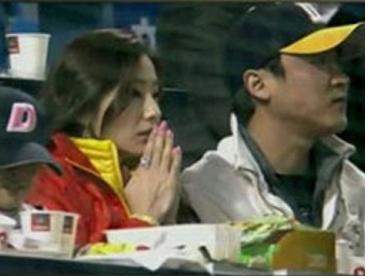 27일 케이블채널 SBS ESPN을 통해 생중계된 2011 프로야구 두산 베어스와 삼성 라이온즈의 경기에는 나란히 관람석에 자리한 한채영과 남편 최동준 씨의 모습이 카메라에 잡혔다.