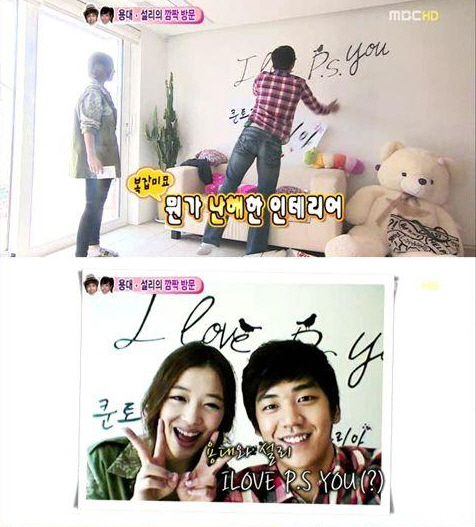 우선 신혼집에 붙일 'PS. I LOVE YOU'라는 문구가 새겨진 벽지를 선물로 가져온 설리는 이용대와 함께 거실 벽에 붙이기를 시도하다가 결국 'I LOVE PS. YOU'라고 붙여 웃음을 자아냈다.