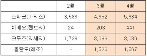 스파크 또한 3월과 4월 각각 4천852대, 5천634대 등을 팔아 2월 마티즈 크리에이티브로 팔린 3천588대에 비해 26%와 36%씩 늘었다.