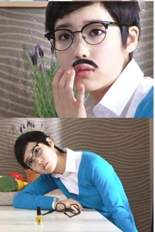 사진 속 아이유는 흰색 셔츠에 파란색 가디건을 입고 가발과 콧수염을 붙여 남자로 변신했다.