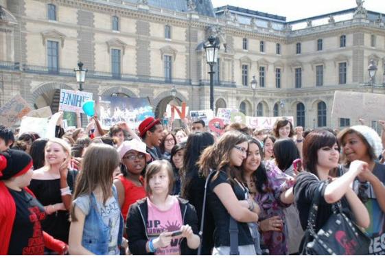 1일(현지시간) 파르 루브르박물관 입구 유리 피라미드 앞에 프랑스 한류팬 300여명이 모여 오는 6월10일 열리는 K팝 스타들의 공연 연장을 요구하는 이색 시위를 벌이고 있다.