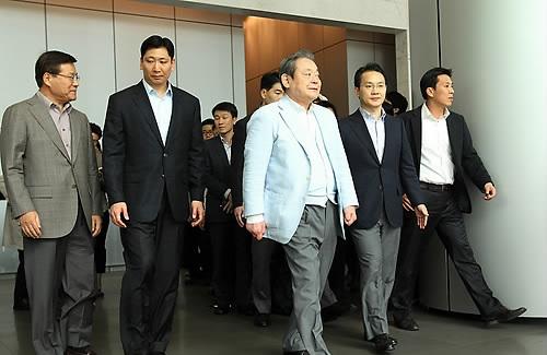 이 회장은 이날 8시5분께 사옥에 나왔으나 홍보팀이 "출근할 때마다 질의응답을 할 수는 없는 것 아니냐"며 기자들의 질문 자체를 봉쇄해 별다른 말 없이 42층 집무실로 향했다.