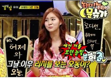 유이는 "리지를 예뻐하는 사람이 많아져서 나도 모르게 질투가 난다"며 "리지를 예뻐하는 사람이 이 자리에 있다"고 말하며 "당시 프로그램 MC였던 강호동이 리지를 쳐다보는 눈빛이 나를 보던 것과 똑같아 섭섭했다”고 고백했다.