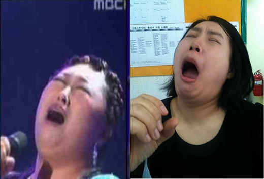 사진 속 BMK는 MBC '우리들의 일밤-서바이벌 나는 가수다'에서 마이크를 붙잡고 입을 벌린 채 열창하고 있으며, 이희경은 BMK와 똑같은 표정을 짓고 있다.