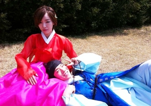 사진 속 조권은 빨간색 저고리가 돋보이는 한복을 곱게 차려입은 가인의 무릎을 베고 누운 모습이다.