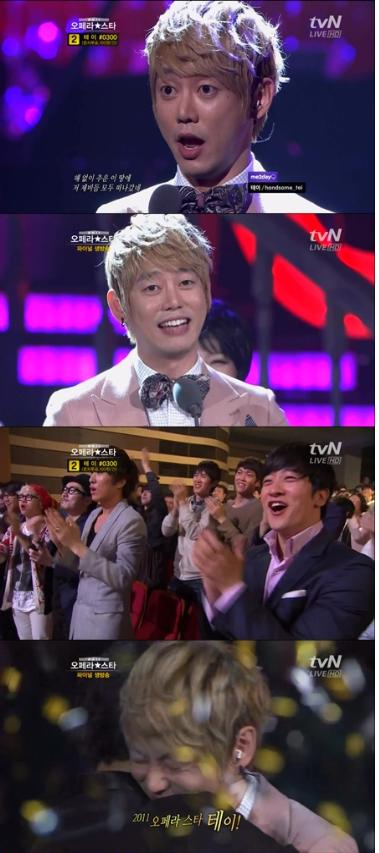 테이는 7일 오후 11시 서울 상명아트센터에서 생방송으로 진행된 tvN '오페라스타' 결승전에서 JK김동욱과 박빙의 승부 끝에 우승자로 선정됐다. 이로써 테이는 영국 로열 필하모닉 오케스트라와 스페셜 앨범을 제작할 수 있는 특전을 얻게 됐다.