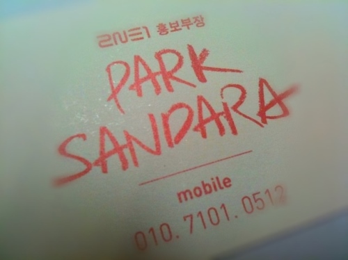 2NE1의 홍보 부장으로도 활동 중인 산다라는 10일 자신의 미투데이에 새로 나온 홍보부장 명함 사진을 올렸다. 산다라는 명함과 함께 “새벽이 되면 센치해지잖아요. 너무 론리한 달옹. 오늘밤 사고치나?! 에라~! 번호공개! 저 너무 론리해요!”라는 글을 남겼다. 태그로 “혹시 일하는 중이면 매니저나 싸부님 다른 멤버가 대신 받을 수도 있습니다”라고 멘트를 남겼다.