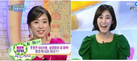 사진 속 최희 아나운서는 지금보다 앳된 모습으로 미모는 여전하다. 당시 이 프로그램에서 21세의 정준하 사돈처녀 역을 맡아 출연했다.